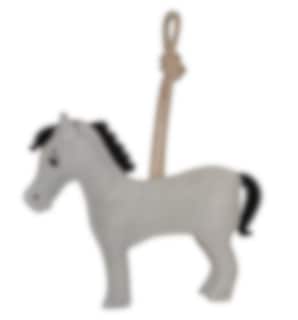 Så populärt det har blivit med leksaker till hästen och här följer vi trenden med en superfin liten grå häst med svart man och svans. Mockamaterialet i hästleksaken är kraftigt och rep används som upphängning.